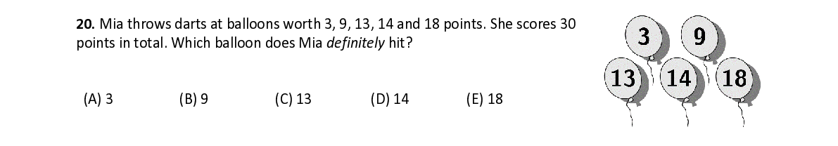 Q20. Mia throws darts at balloons worth 3, 9, 13, 14 and 18 points. She scores 30 points in total. Which balloon does Mia definitely hit?