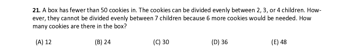 Q21. A box has fewer than 50 cookies in. The cookies can be divided evenly between 2, 3, or 4 children. How- ever, they cannot be divided evenly between 7 children because 6 more cookies would be needed. How many cookies are there in the box?