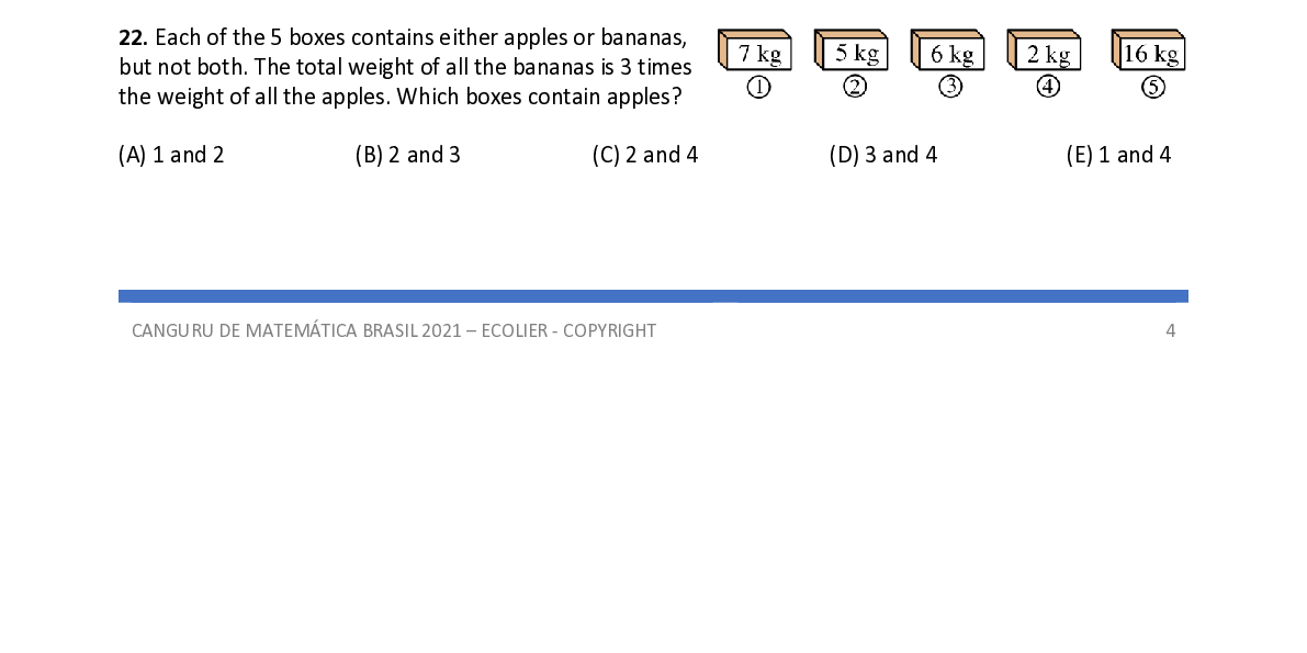 Q22. Each of the 5 boxes contains either apples or bananas, but not both. The total weight of all the bananas is 3 times the weight of all the apples. Which boxes contain apples?