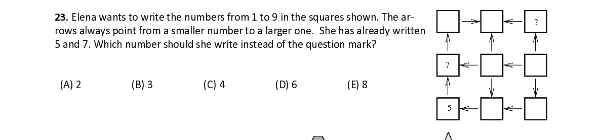 Q23. Elena wants to write the numbers from 1 to 9 in the squares shown. The ar- rows always point from a smaller number to a larger one. She has already written