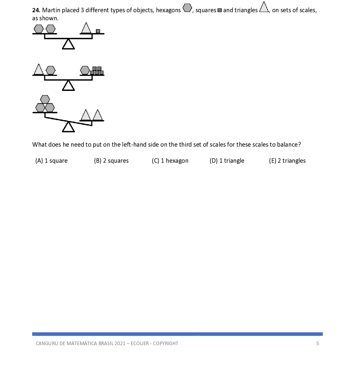 Q24. Martin placed 3 different types of objects, hexagons , squares and triangles , on sets of scales, as shown. What does he need to put on the left - hand side on the third set of scales for these scales to balance?