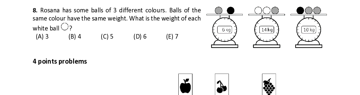 Q8. Rosana has some balls of 3 different colours. Balls of the same colour have the same weight. What is the weight of each white ball ?