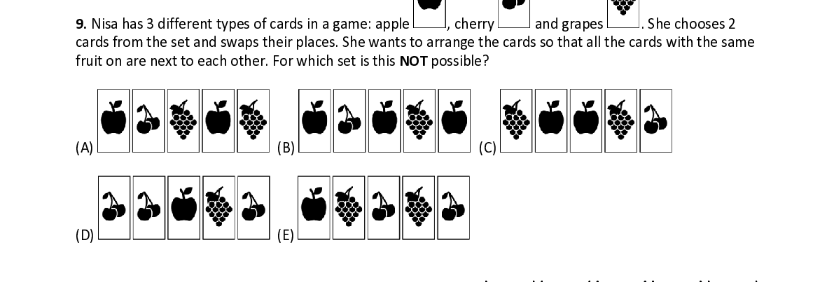 Q9. Nisa has 3 different types of cards in a game: apple , cherry and grapes . She chooses 2 cards from the set and swaps their places. She wants to arrange the cards so that all the cards with the same fruit on are next to each other. For which set is this NOT possible?