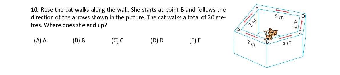 Q10. Rose the cat walks along the wall. She starts at point B and follows the direction of the arrows shown in the picture. The cat walks a total of 20 me- tres. Where does she end up?