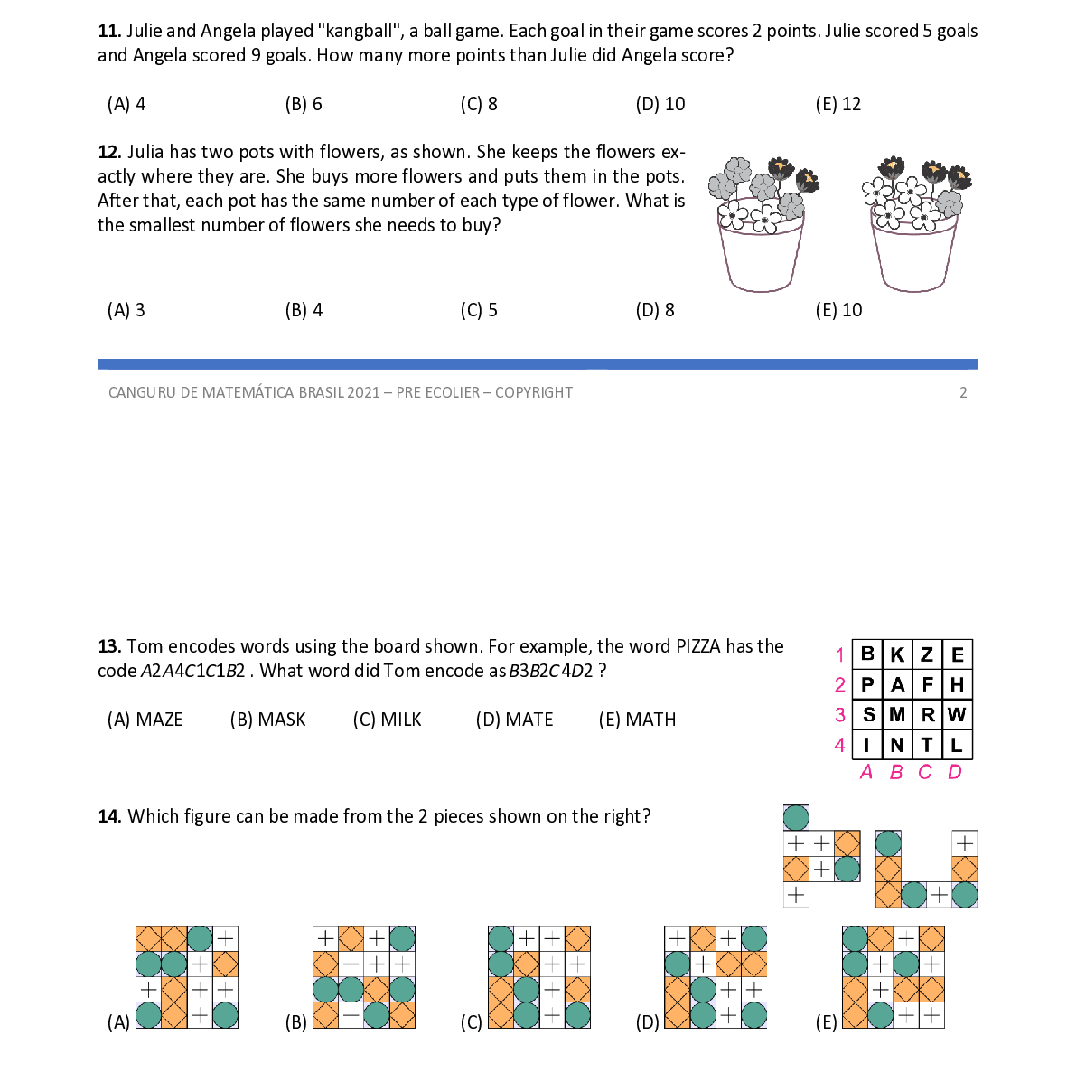 Q13. Tom encodes words using the board shown. For example, the word PIZZA has the code AACCB 2 4 1 1 2 . What word did Tom encode as BBCD 3 2 4 2 ?
