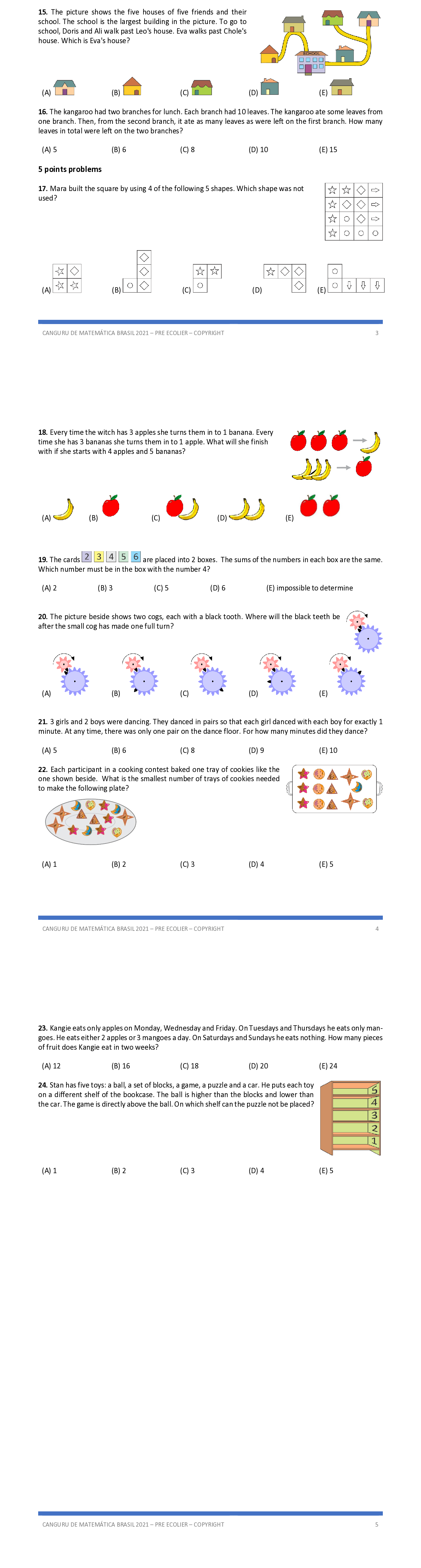 Q15. The picture shows the five houses of five friends and their school. The school is the largest building in the picture. To go to school, Doris and Ali walk past Leo's house. Eva walks past Chole's house. Which is Eva's house?