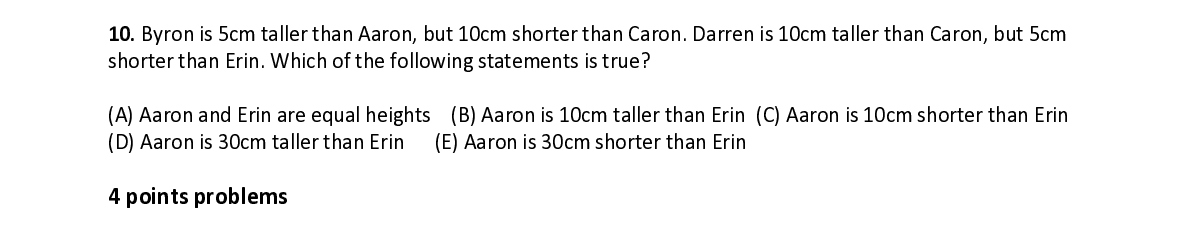 Q10. Byron is 5cm taller than Aaron, but 10cm shorter than Caron. Darren is 10cm taller than Caron, but 5cm shorter than Erin. Which of the following statements is true?