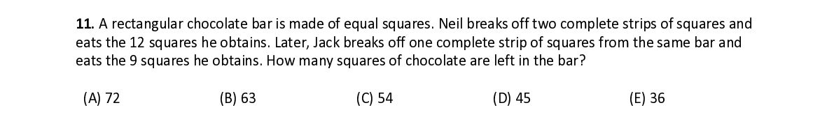 Q11. A rectangular chocolate bar is made of equal squares. Neil breaks off two complete strips of squares and eats the 12 squares he obtains. Later, Jack breaks off one complete strip of squares from the same bar and eats the 9 squares he o btains. How many squares of chocolate are left in the bar?