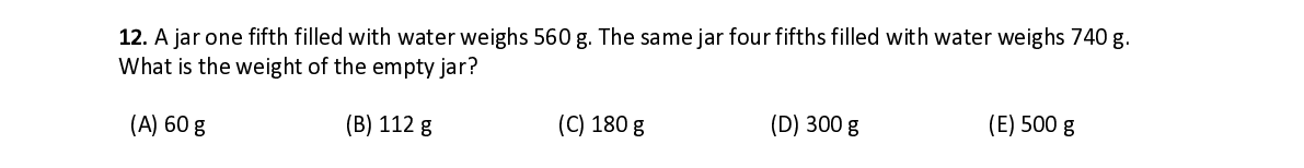 Q12. A jar one fifth filled with water weighs 560 g. The same jar four fifths filled with water weighs 740 g. What is the weight of the empty jar?