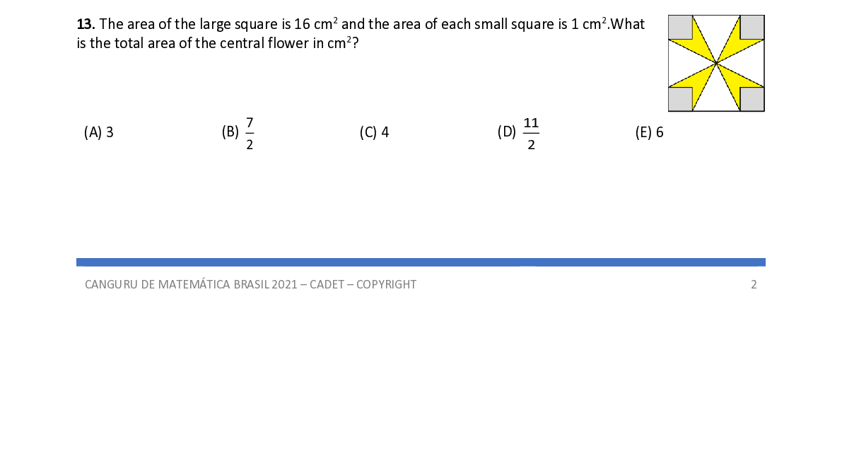 Q13. The area of the large square is 16 cm 2 and the area of each small square is 1 cm 2 . What is the total area of the central flower in cm 2 ? 7 11