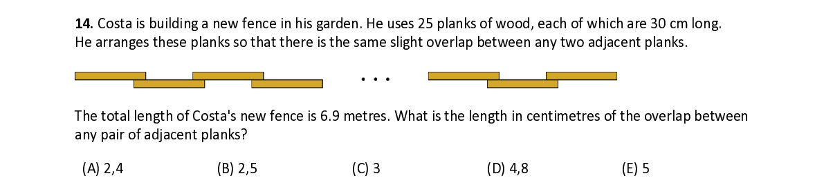 Q14. Costa is building a new fence in his garden. He uses 25 planks of wood, each of which are 30 cm long. He arranges these planks so that there is the same slight overlap between any two adjacent planks. The total length of Costa's new fence is 6.9 metres. What is the length in centimetres of the overlap between any pair of adjacent planks?