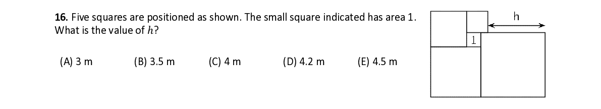Q16. Five squares are positioned as shown. The small square indicated has area 1. What is the value of ℎ ?