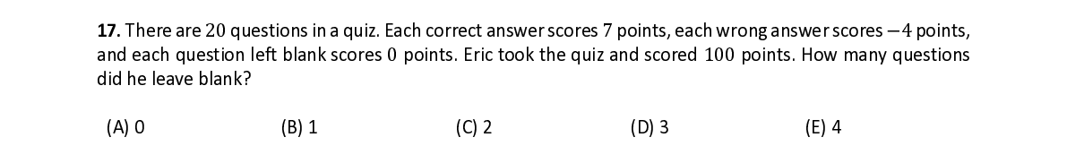 Q17. There are 20 questions in a quiz. Each correct answer scores 7 points, each wrong answer scores − 4 points, and each question left blank scores 0 points. Eric took the quiz and scored 100 points. How many questions did he leave blank?
