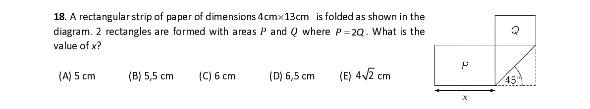 Q18. A rectangular strip of paper of dimensions 4cm 13cm is folded as shown in the diagram. 2 rectangles are formed with areas 푃 and 푄 where PQ = 2 . What is the value of x ?