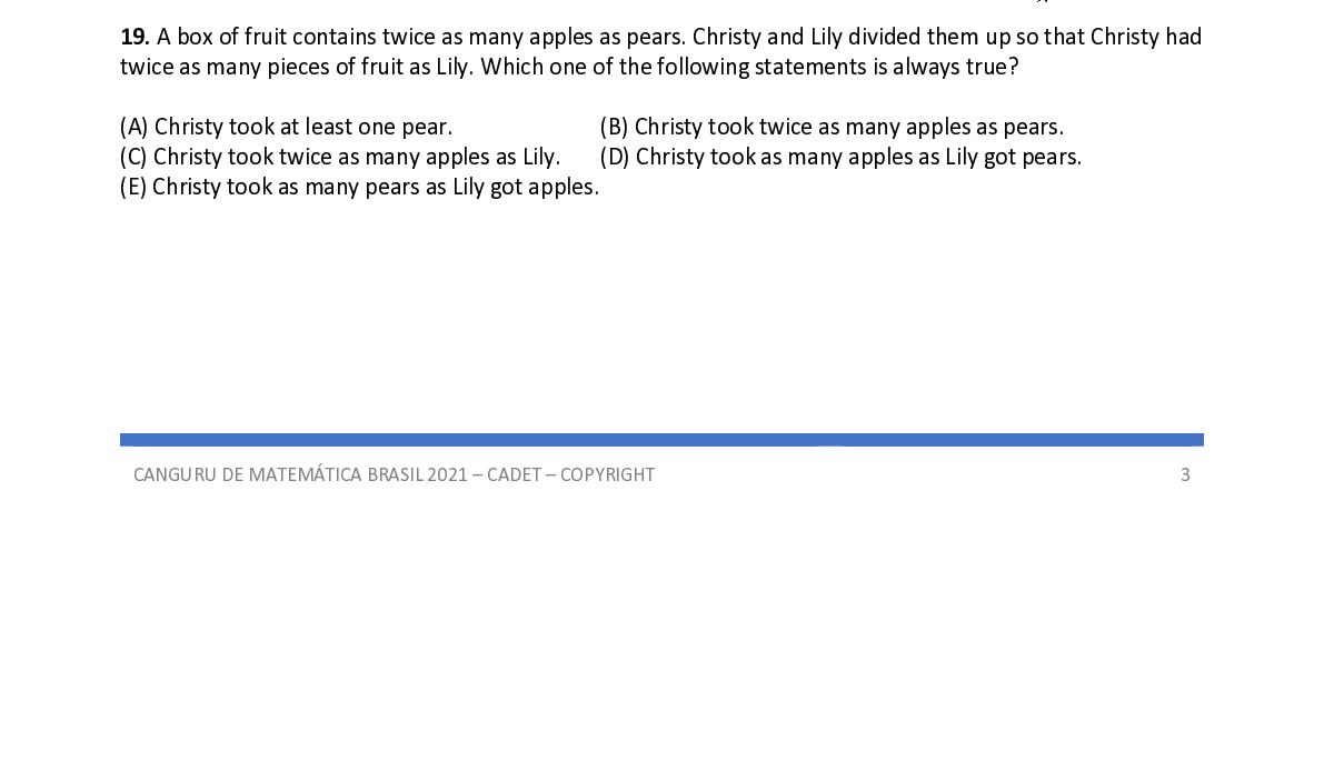 Q19. A box of fruit contains twice as many apples as pears. Christy and Lily divided them up so that Christy had twice as many pieces of fruit as Lily. Which one of the following statements is always true?