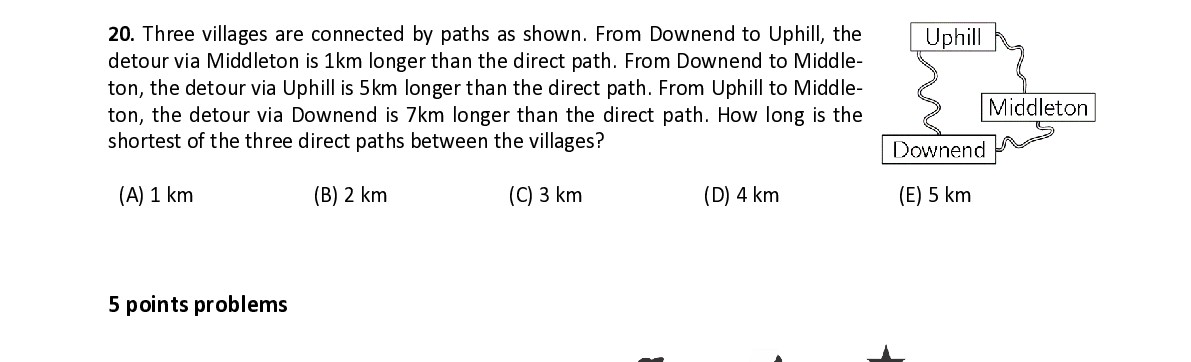 Q20. Three villages are connected by paths as shown. From Downend to Uphill, the detour via Middleton is 1km longer than the direct path. From Downend to Middle- ton, the detour via Uphill is 5km longer than the direct path. From Uphill to Middle- ton, the detour via Dow nend is 7km longer than the direct path. How long is the shortest of the three direct paths between the villages?