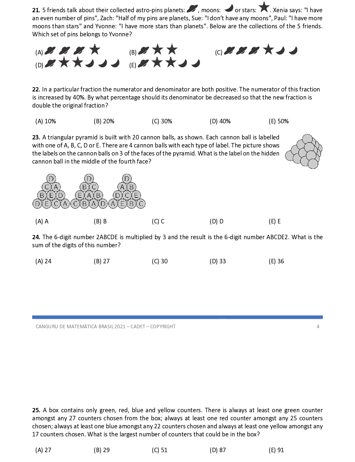 Q23. A triangular pyramid is built with 20 cannon balls, as shown. Each cannon ball is labelled with one of A, B, C, D or E. There are 4 cannon balls with each type of label. The picture shows the labels on the cannon balls on 3 of the faces of the pyramid. What is the label on the hidden cannon ba ll in the middle of the fourth face?