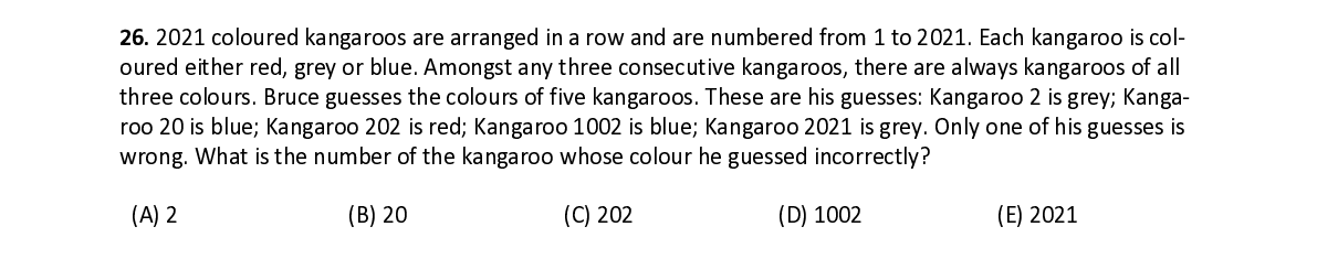 Q26. 2021 coloured kangaroos are arranged in a row and are numbered from 1 to 2021. Each kangaroo is col- oured either red, grey or blue. Amongst any three consecutive kangaroos, there are always kangaroos of all three colours. Bruce guesses the colours of five kangaroos. These are his guesses: Kangaroo 2 is grey; Kanga- roo 20 is blue; Kangaroo 202 is red; Kangaroo 1002 is blue; Kangaroo 2021 is grey. Only one of his guesses is wrong. What is the number of the kangaroo whose colour he guessed incorrectly?