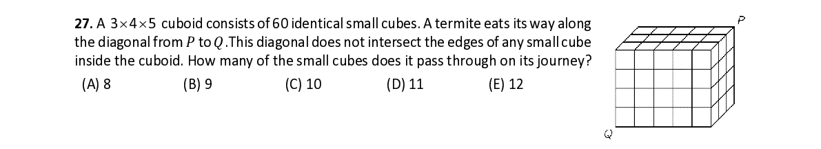 Q27. A 3 4 5 cuboid consists of 60 identical small cubes. A termite eats its way along the diagonal from 푃 to 푄 .This diagonal does not intersect the edges of any small cube inside the cuboid. How many of the small cubes does it pass through on its journey?