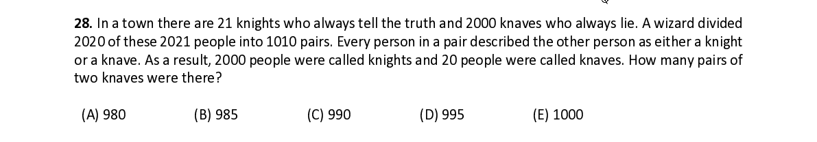 Q28. In a town there are 21 knights who always tell the truth and 2000 knaves who always lie. A wizard divided
