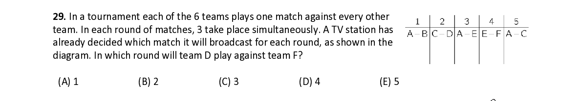 Q29. In a tournament each of the 6 teams plays one match against every other team. In each round of matches, 3 take place simultaneously. A TV station has already decided which match it will broadcast for each round, as shown in the diagram. In which round will team D play against team F?
