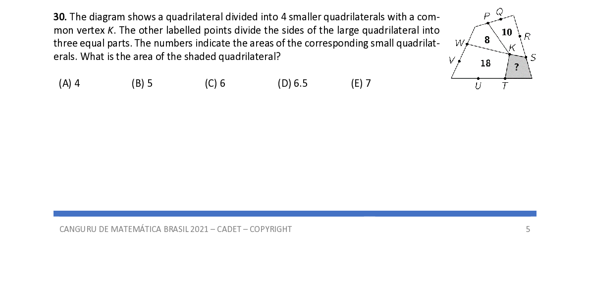 Q30. The diagram shows a quadrilateral divided into 4 smaller quadrilaterals with a com- mon vertex K . The other labelled points divide the sides of the large quadrilateral into three equal parts. The numbers indicate the areas of the corresponding small quadrilat- erals. What is the area of the shaded quadrilateral?
