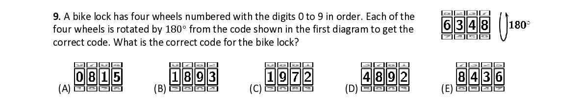 Q9. A bike lock has four wheels numbered with the digits 0 to 9 in order. Each of the four wheels is rotated by 180° from the code shown in the first diagram to get the correct code. What is the correct code for the bike lock?