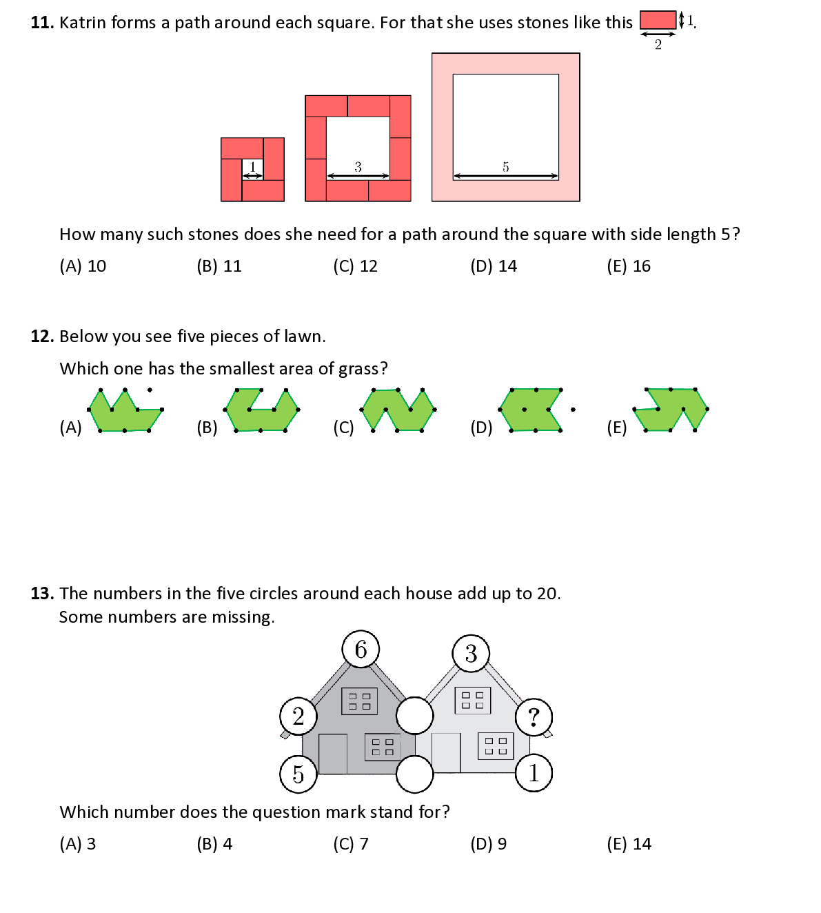 Q12. Below you see five pieces of lawn . Which one has the smallest area of grass ?
