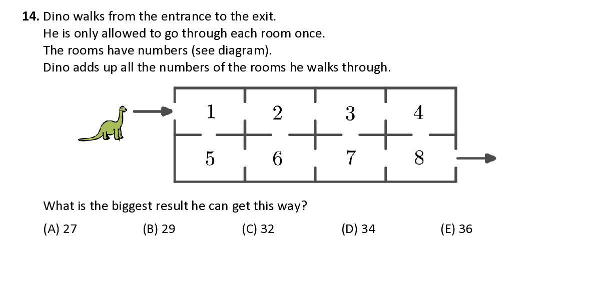 Q14. Dino walks from the entrance to the exit. He is only allowed to go through each room once. The rooms have numbers (see diagram). Dino adds up all the numbers of the rooms he walks through. What is the biggest result he can get this way ?
