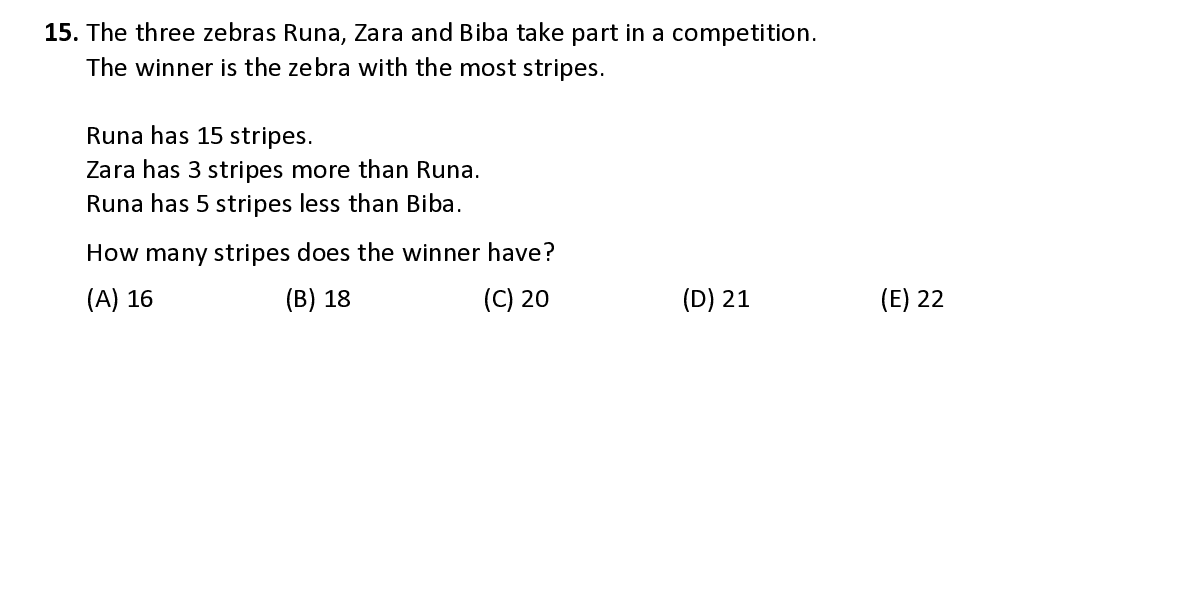 Q15. The three zebras Runa, Zara a nd Biba take part in a competition. The winner is the zebra with the most strip e s. Runa ha s 15 strip e s . Zara ha s 3 strip e s more than Runa. Runa ha s 5 strip e s less than Biba. How many strip e s does the winner have ?