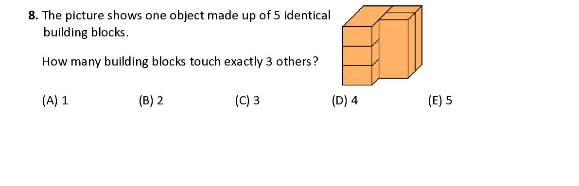 Q8. The picture shows one object made up of 5 identical building blocks . How many building blocks touch exactly 3 others ?