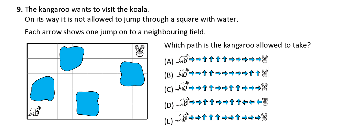 Q9. The kangaroo wants to visit the koala . On its way it is not allowed to jump through a square with water . Each arrow shows one jump on to a neighbouring field . W hich path is the kangaroo allowed to take ?