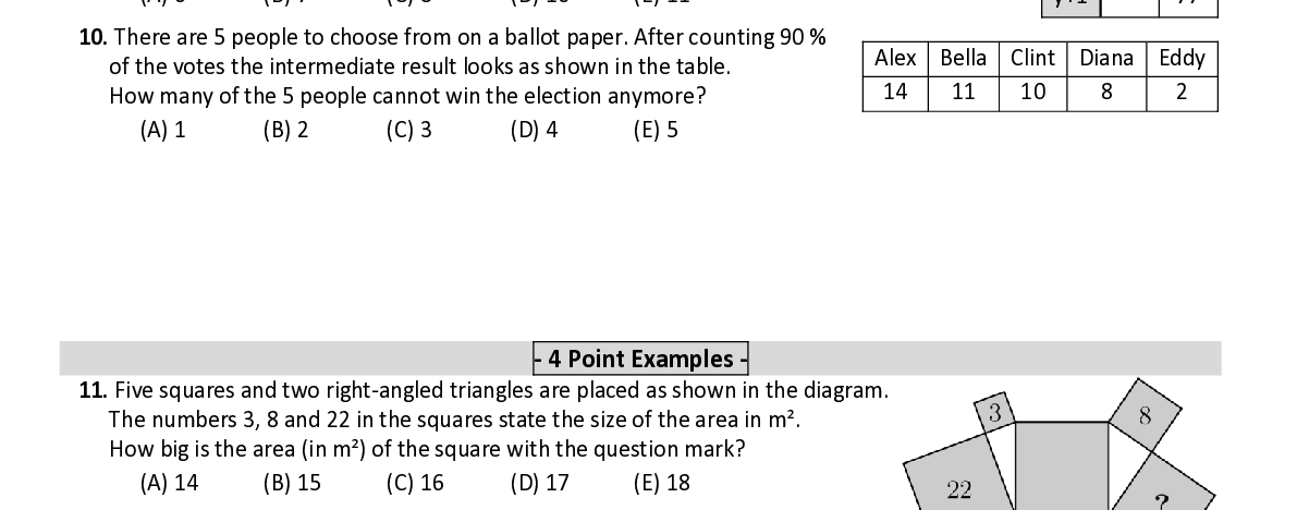 Q10. There are 5 people to choose from on a ballot paper. After counting 90 % Alex Bella C lint Diana Eddy of the votes the intermediate result looks as shown in the table. How many of the 5 people cannot win the election anymore? 14 11 10 8 2