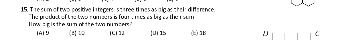 Q15. The sum of two positive integers is three times as big as their difference. The product of the two numbers is four times as big as their sum . How big is the sum of the two numbers ?