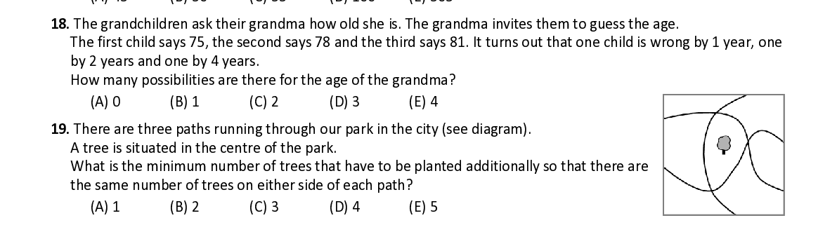 Q19. There are three paths running through our park in the city (see diagram). A tree is situated in the centre of the park. What is the minimum number of trees that have to be planted additionally so that there are the same number of trees on either side of each path ?