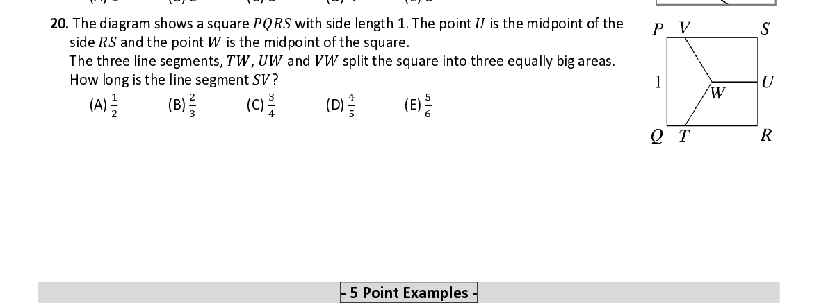 Q20. The diagram shows a square 푃푄푅푆 with side length 1. The point 푈 is the midpoint of the side 푅푆 a nd the point 푊 is the midpoint of the square. The three line segments , 푇푊 , 푈푊 a nd 푉푊 split the square into three equally big areas . How long is the line segment 푆푉 ?