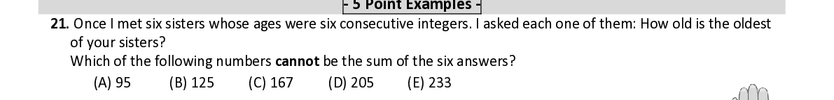 Q21. Once I met six sisters whose ages were six consecutive integers. I asked each one of them: How old is the oldest of your sisters ? W hich of the following numbers cannot be the sum of the six answers ?