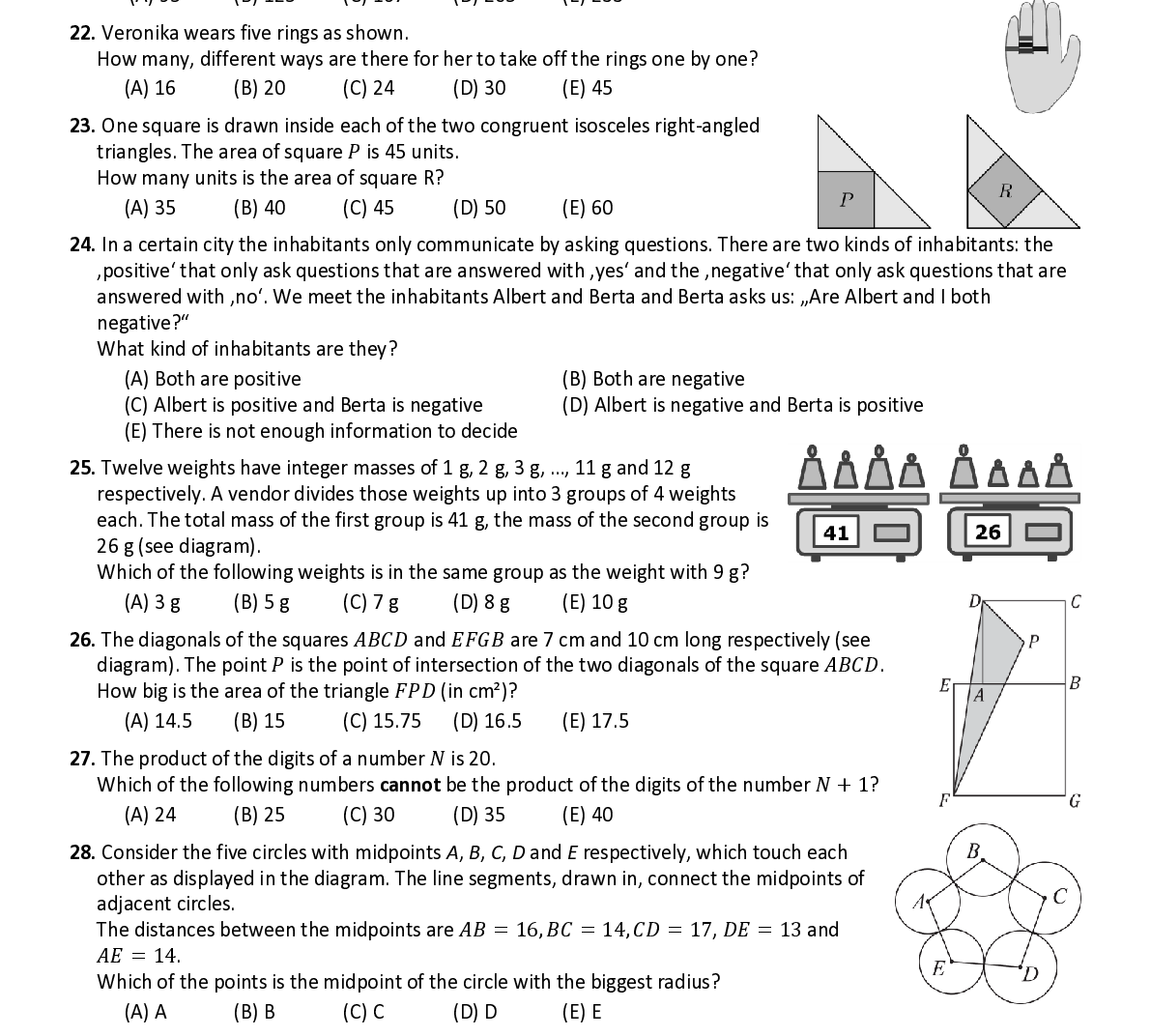Q28. Consider the five circles with midpoints A , B , C , D and E respectively , which touch each other as displayed in the diagram. The line segments , drawn in, connect the midpoints of adjacent circles. The distances between the midpoints are 퐴퐵 = 16 , 퐵퐶 = 14 , 퐶퐷 = 17 , 퐷퐸 = 13 a nd 퐴퐸 = 14 . W hich of the points is the midpoint of the circle with the biggest radius ?