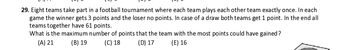 Q29. Eight t eams tak e part in a football tournament where each team plays each other team exactly once. In each game the winner gets 3 points and the loser no points. In case of a draw both teams get 1 point . In the end all teams together have 61 points . What is the maxi mum number of points that the team with the most points could have gained ?