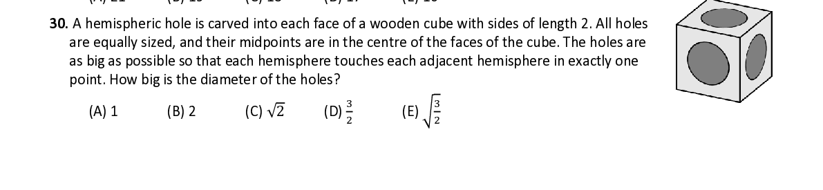 Q30. A hemispheric hole is carved i n to each face of a wooden cube with side s of length 2 . All holes are equally sized, and their midpoints are in the centre of the faces of the cube. The holes are as big as possible so that each hemisphere touches each adjacent hemisphere in exactly one point . How big is the diameter of the holes ? 3 3