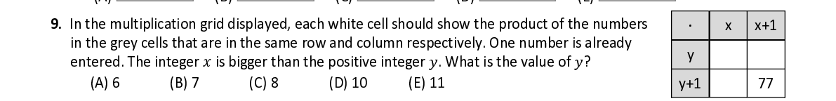Q9. In the multiplication grid displayed , each white cell should show the product of the numbers ∙ x x+1 in the grey cells that are in the same row and column respectively. One number is already y entered. The integer 푥 is bigger than the positive integer 푦 . W hat is the valu e of 푦 ?