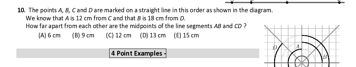 Q10. The points A, B, C a nd D are marked on a straight line in this order as shown in the diagram . W e know that A is 12 cm from C and that B is 18 cm from D . How far apart from each other are the midpoints of the line segments AB a nd CD ?
