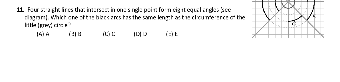 Q11. Four straight lines that intersect in one single point form eight equal angles (see diagram). Which one of the black arcs has the same length as the circumference of the little (grey) circle?