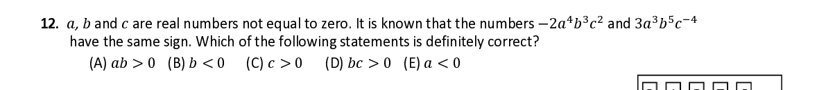 Q12. 푎 , 푏 a nd 푐 are real numbers not equal to zero . It is known that the numbers − 2 푎 푏 푐 a nd 3 푎 푏 푐 have the same sign. Which of the following statements is definitely correct ?