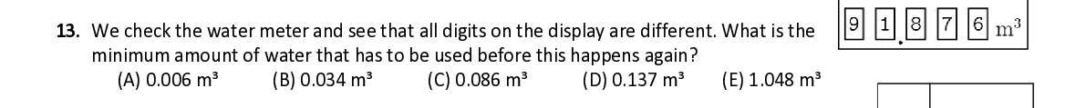 Q13. W e check the water meter and see that all digits on the display are different. What is the minimum amount of water that has to be used before this happens again?