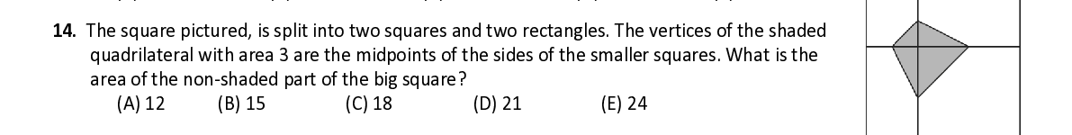 Q14. The square pictured , is split into two squares and two rectangles. The vertices of the shaded quadrilateral with area 3 are the midpoints of the sides of the smaller squares. What is t he area of the non - shaded part of the big square ?