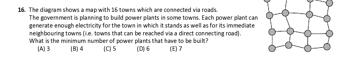 Q16. The diagram shows a map with 16 towns which are connected via roads. The government is planning to build power plants in some towns. Each power plan t can generate enough electricity for the town in which it stands as well as for its immediate neighbouring towns (i.e. towns that can be reached via a direct connecting road). What is the minimum number of power plants that have to be built?