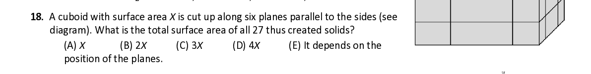 Q18. A cuboid with surface area X is cut up along six planes parallel to the sides (see diagram). What is the total surface area of all 27 thus created solids ?