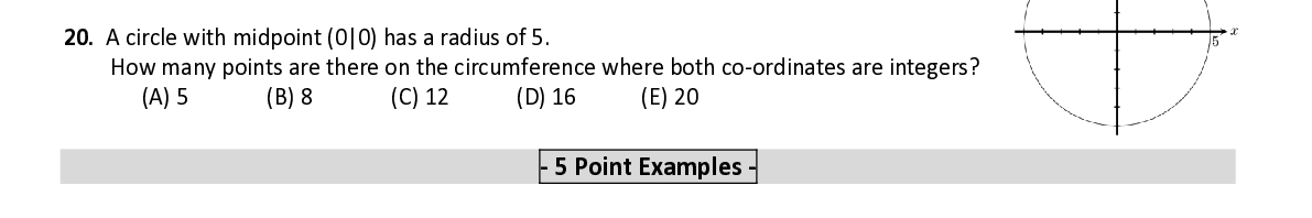 Q20. A circle with midpoint (0 | 0) ha s a radius of 5. How many points are there on the circumference where both co - ordinates are integers ?