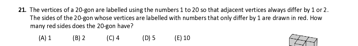 Q21. The vertices of a 20 - gon are labelled using the numbers 1 to 20 so that adjacent vertices always differ by 1 or 2. The sides of the 20 - gon whose vertices are labelled with numbers that only differ by 1 are drawn in red. How many r ed sides does the 20 - gon have ?
